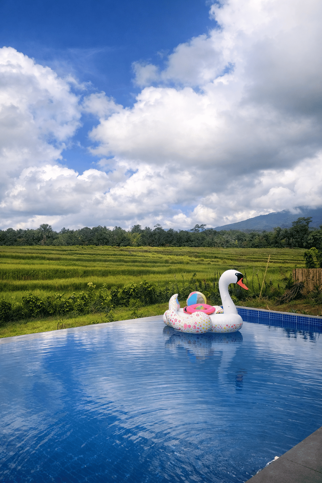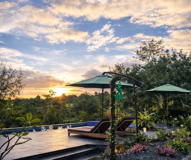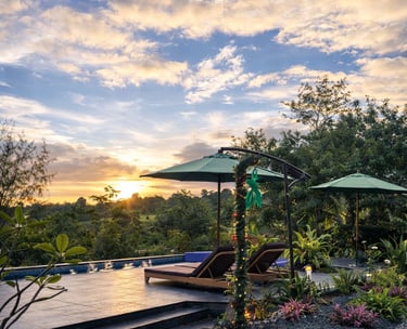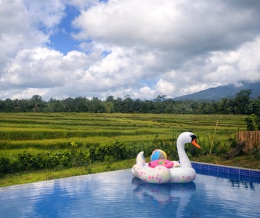A warm & inviting suite, wake-up with infinity pool and rice field views, perfect for unwinding after a day outdoors.